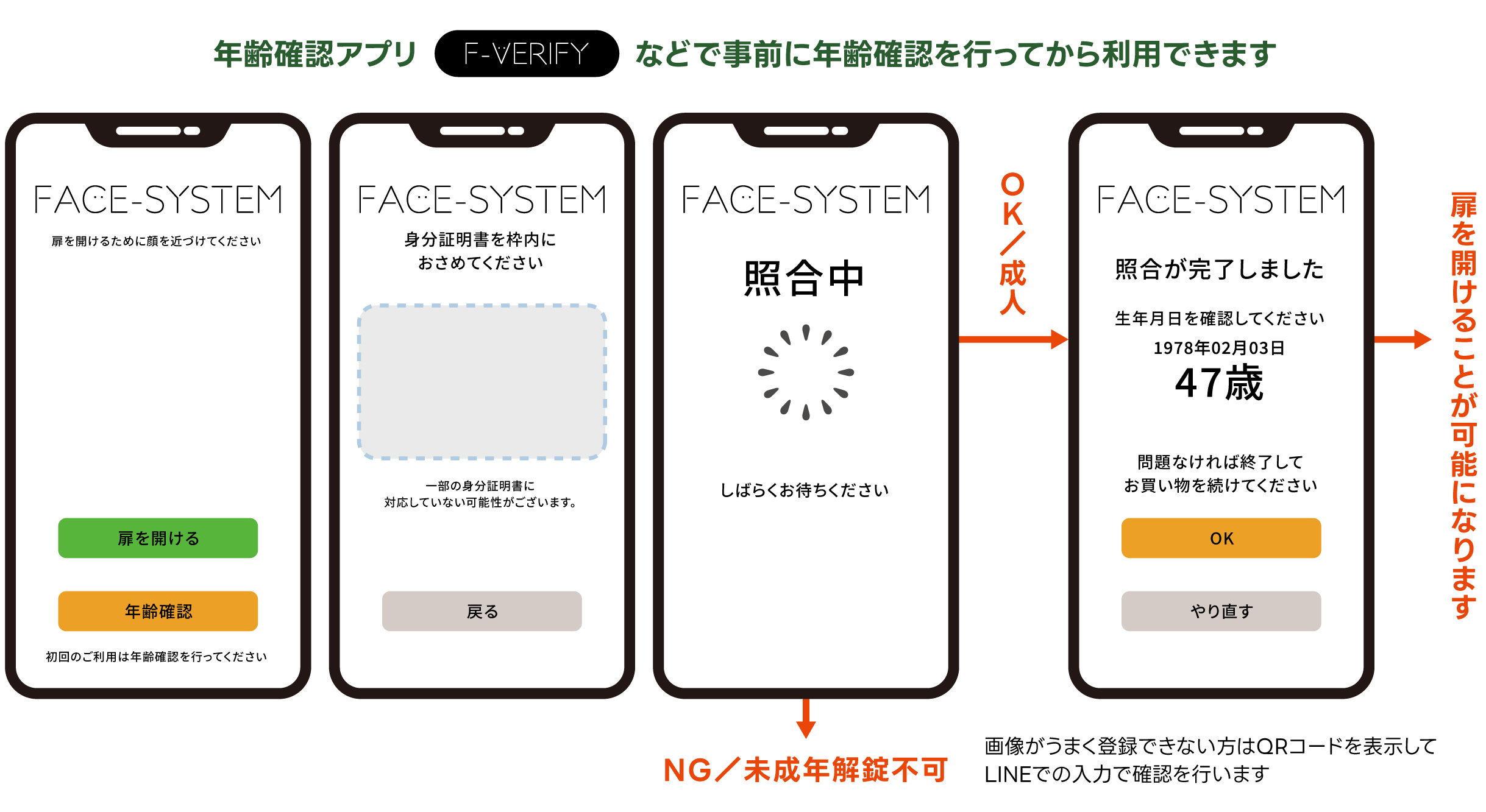 事前に顔認証年齢確認アプリ「F-VERIFY」などでドアを開ける前に年齢確認をしてもらいます。